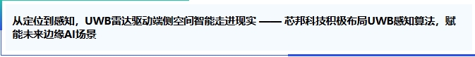 在这一全球趋势带动下,芯邦科技也正积极推进 UWB 雷达在端侧空间智能领域的算法研发,聚焦于高鲁棒(抗干扰与环境适应)、低功耗、可嵌入(适配边缘化设备)的边缘部署能力。